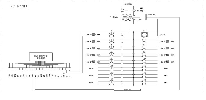 隔離盤系統包含1台隔離變壓器(Shield Isolation Transformer),一次側模殼式斷路器1只,二次側模殼式斷路器8只及1只線路隔離監視器(Line Isolation Monitor),結線圖如下所示: