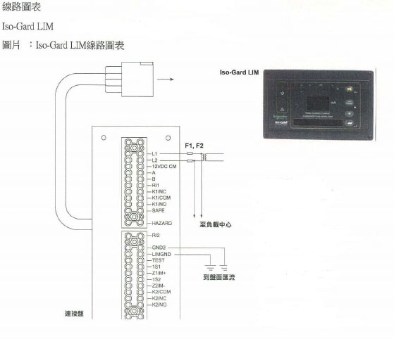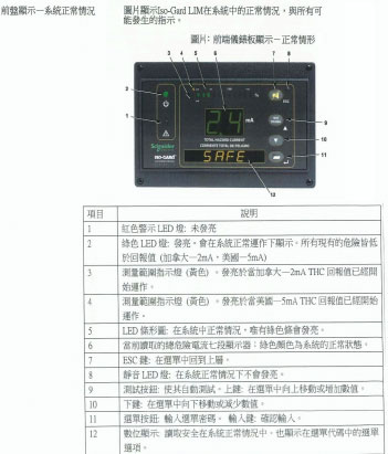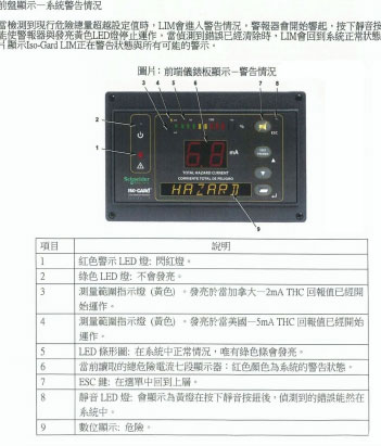 3.2.1監視器可同時偵側二條電源對地之阻抗,檢出不正常之漏電電流,LIM有測試開關及漏電電流錶,紅色指示燈指示危險狀況,綠色指示燈指示安全狀況,電錶指示漏電電流,警報設定點為 2mA 或 5mA 。